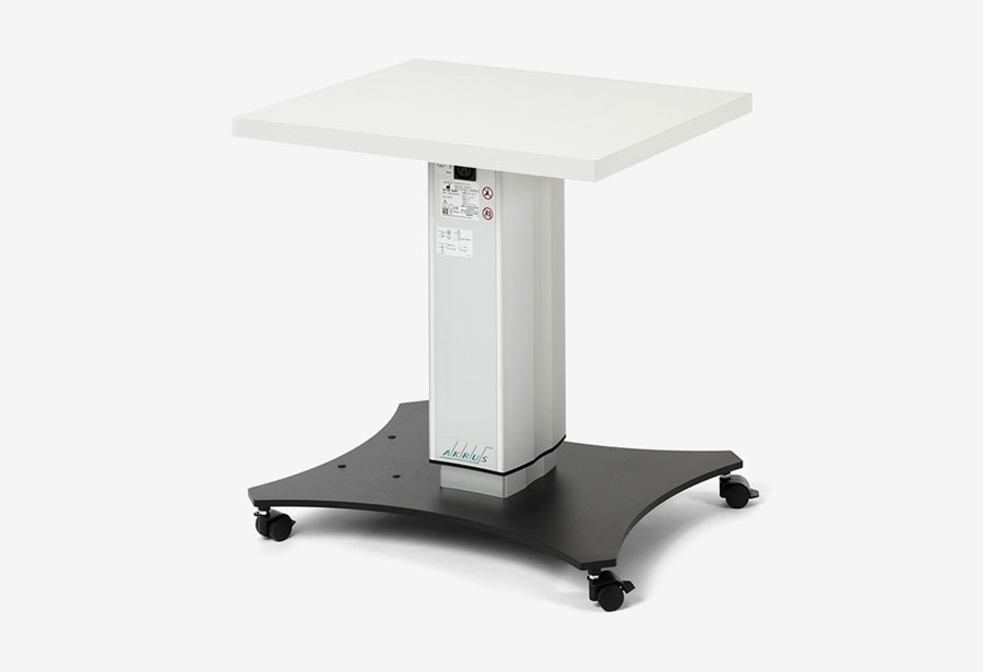 The powerful double-lift solution with two motorized columns: mobile, electrically height-adjustable instrument support table with synchronous column control. Wheelchair accessibility thanks to the column spacing and 100 kg lifting capacity. Cable compartment and IEC sockets under the table top and lockable castors.